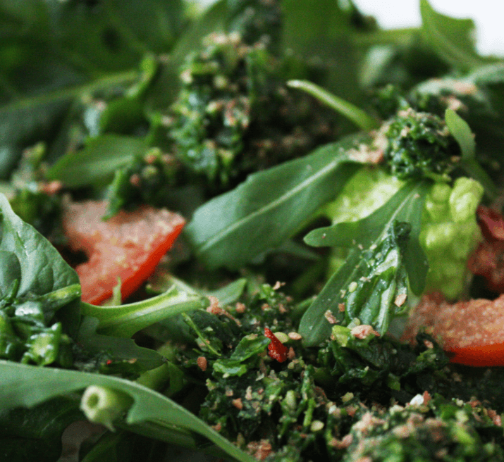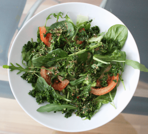 Blend the spinach and basil leaves along with the garlic, a splash of extra virgin olive oil and a pinch of sea salt.